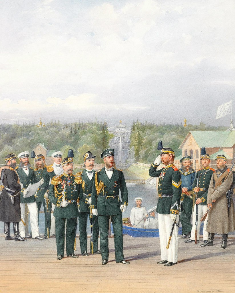 Офицеры и нижние чины у фонтана Нептун на фоне дв. в Петергофе